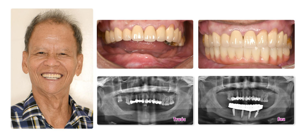 Như trường hợp của chú Dũng (65 tuổi), lựa chọn đeo hàm tháo lắp trong suốt 2 năm với hy vọng khôi phục chức năng ăn nhai. Trái với mong đợi, 2 năm qua chú Dũng vừa không thể ăn uống thoải mái, phải thường xuyên ăn cháo, vừa nói chuyện không liền mạch và phát âm không chuẩn xác. May mắn đến Nha khoa Elite Dental gặp Tiến sĩ Bác sĩ Trần Hùng Lâm, chú được chẩn đoán, đánh giá và chỉ định cấy 4 trụ Implant vào hàm dưới để phục hồi răng mất theo kỹ thuật ProArch/All-on-4. Kết thúc quá trình điều trị, chú Dũng đã sở hữu hàm răng khỏe đẹp như ý, hoàn toàn tìm lại được cảm giác ăn nhai thoải mái và tự tin trò chuyện với người thân, bạn bè.